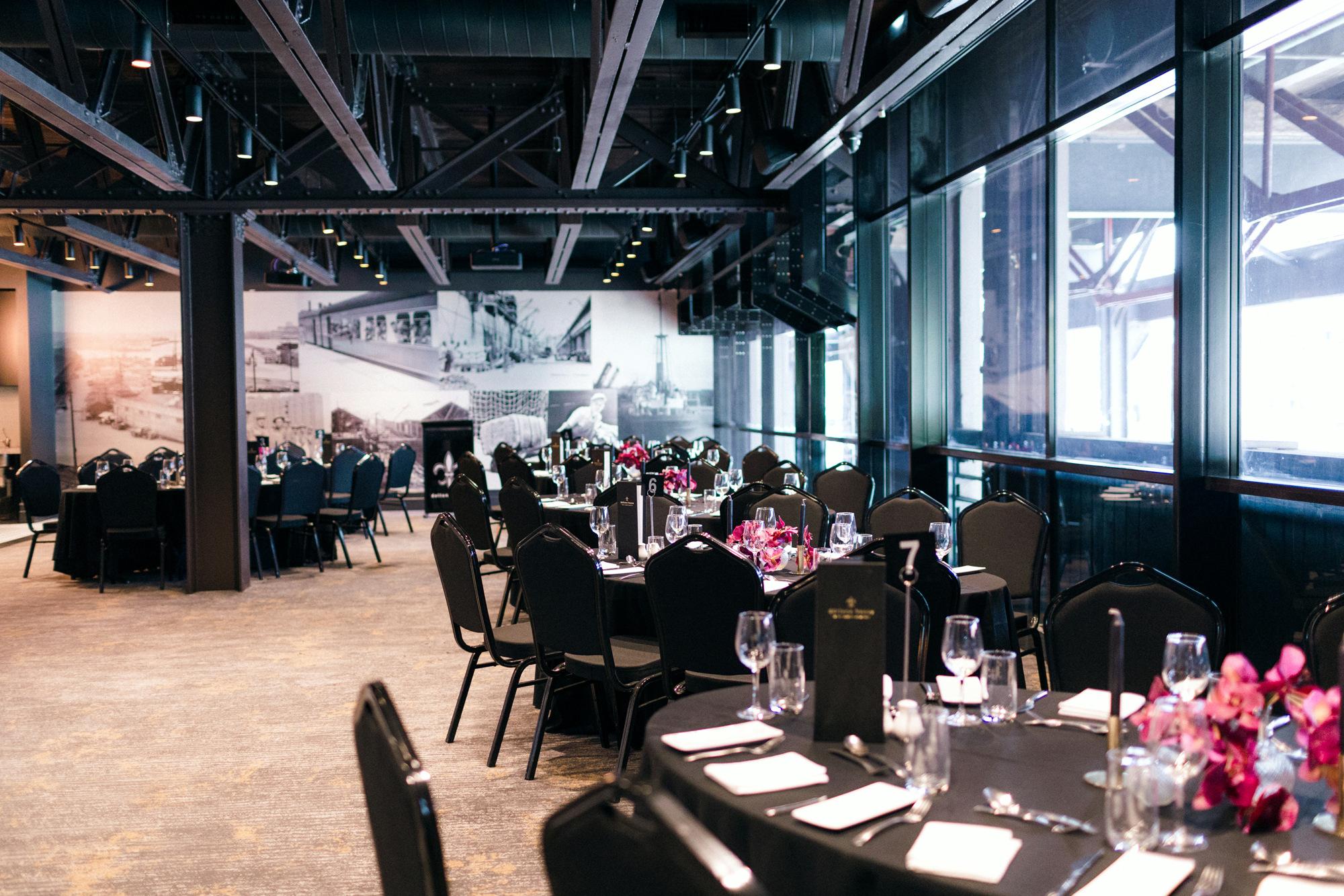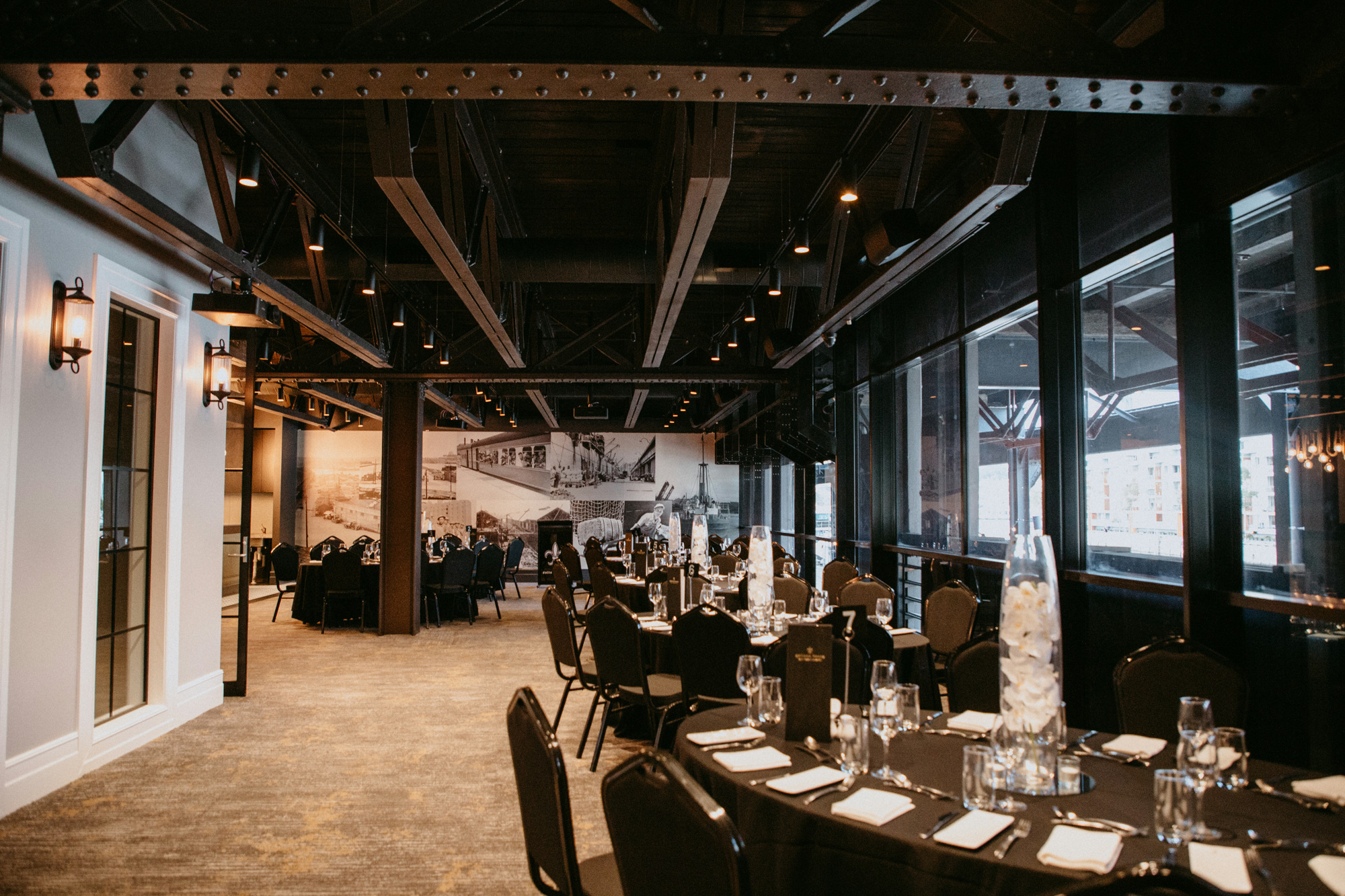 Perfect for intimate, stylish gatherings, Harbour’s industrial steel beams and oversized window frames create a dramatic yet inviting space. Rustic rope pendant lights accent the bar, while natural light floods the room through its floor-to-ceiling windows.