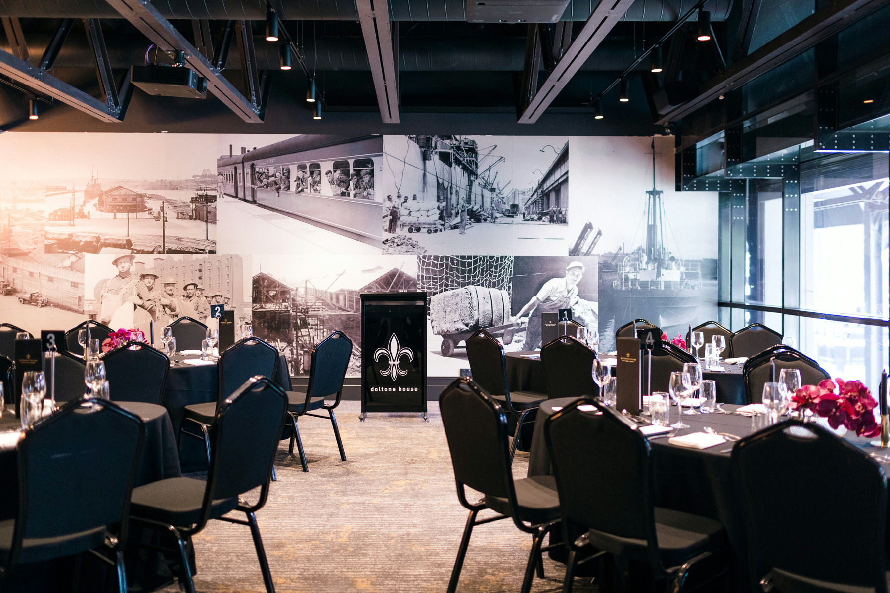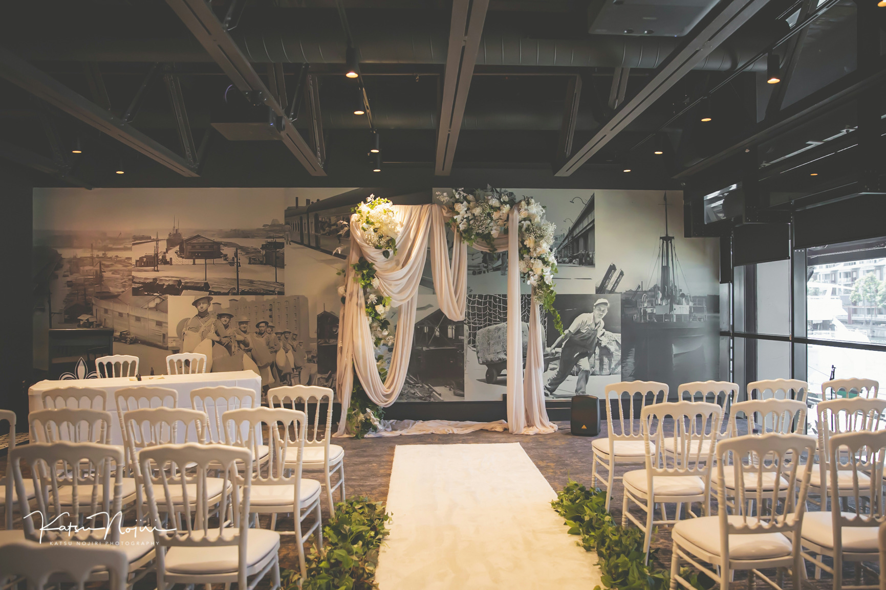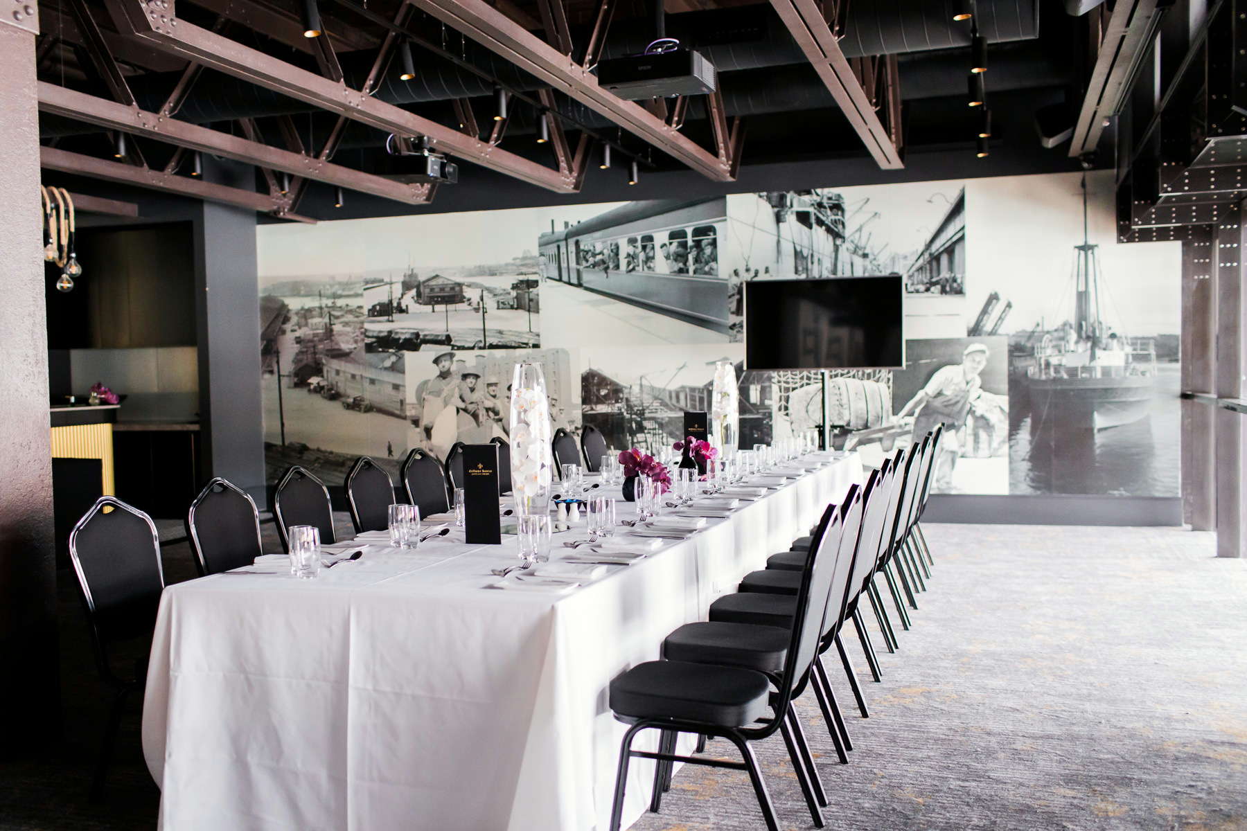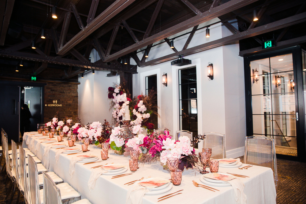Perfect for intimate ceremonies and receptions, Harbour is an effortlessly romantic space. Its exposed steel beams, striking industrial details, and oversized windows allow natural light to flood the room, while rustic pendant lighting adds warmth to the celebrations.